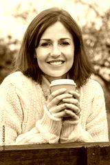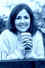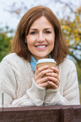 Attractive Happy Middle Aged Woman Resting on Fence With Coffee