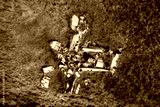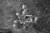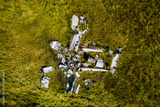 Top-down aerial view of an old aircraft crash site (Vampire Jet) in the Brecon Beacons
