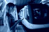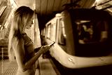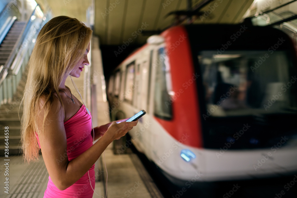 Young woman waiting subway (metro) and using her mobile phone in Barcelona, Spain