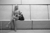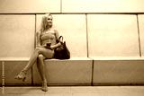 Young woman with colorful dress seated and waiting for the train to arrive in Barcelona, Spain