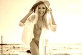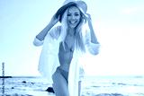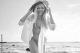 Young pretty cheerful blond woman in swimsuit wearing shirt and hat happily looking in camera with sea on background