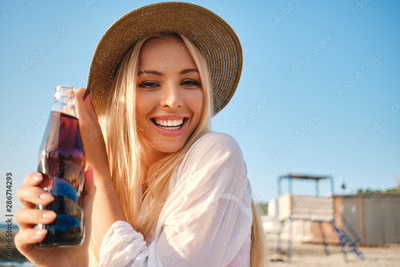 Young pretty smiling blond woman in hat holding glass bottle with soda water while happily looking in camera on beach