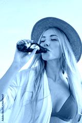 Young beautiful blond woman in swimsuit and hat dreamily drinking soda water by the sea alone