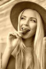 Portrait of young attractive blond woman in swimsuit and hat dreamily looking aside while eating strawberry on beach
