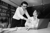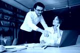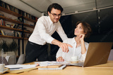 Young attractive business colleagues happily working on new project with laptop and papers in office