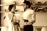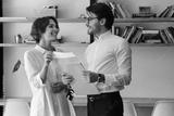 Young attractive business colleagues standing with envelope letter while happily looking at each other in modern office