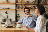 Young attractive business colleagues sitting at the table with laptop and coffee while happily talking at work in modern office