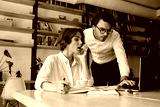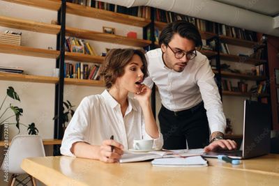 Young emotional business colleagues amazedly using laptop working on new project together in office