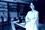 Young attractive woman in white shirt dreamily looking in camera with desk on background in office