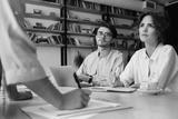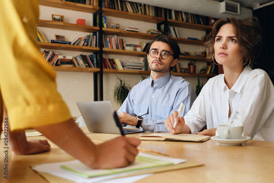 Young business colleagues sitting at the desk with laptop thoughtfully looking at boss while working with papers in modern office