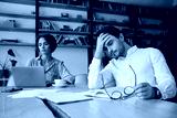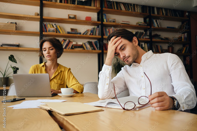 Young tired man sitting at the table with notepad and eyeglasses while thoughtfully holding hand near head at work in office with colleague on background