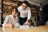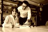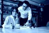Young attractive business colleagues dreamily working on new project with laptop in office