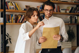 Young serious business colleagues standing with envelope letter while thoughtfully working together in modern office