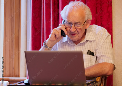 Old elderly senior man on phone at laptop computer at risk to cyber attack and online bank fraud