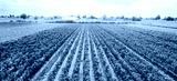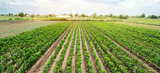 Rows / plantation of young pepper on a farm on a sunny day. Growing organic vegetables. Eco-friendly products. Agriculture land and farming. Agro business. Ukraine, Kherson region