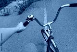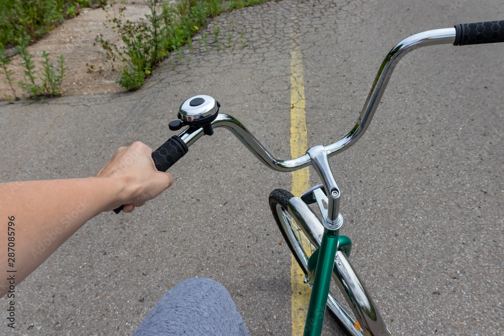Female hand holding a bicycle handlebar and riding a bike on a road with yellow marking, bicycle travelling and journey