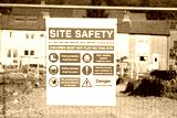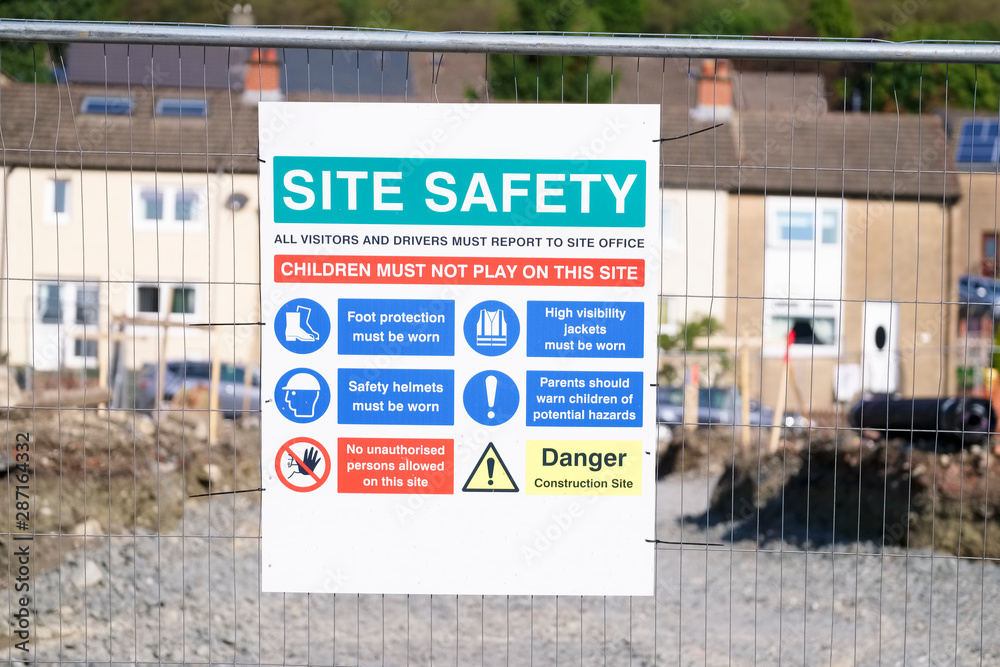 Site safety sign on construction building area fence
