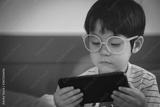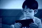 Cute little child watching cartoon on smartphone in the dark room. Dangers of blue light damage his eyes. Handsome little boy can get age related macular degeneration of blue light, he wear eyeglasses