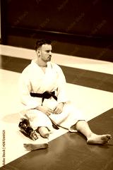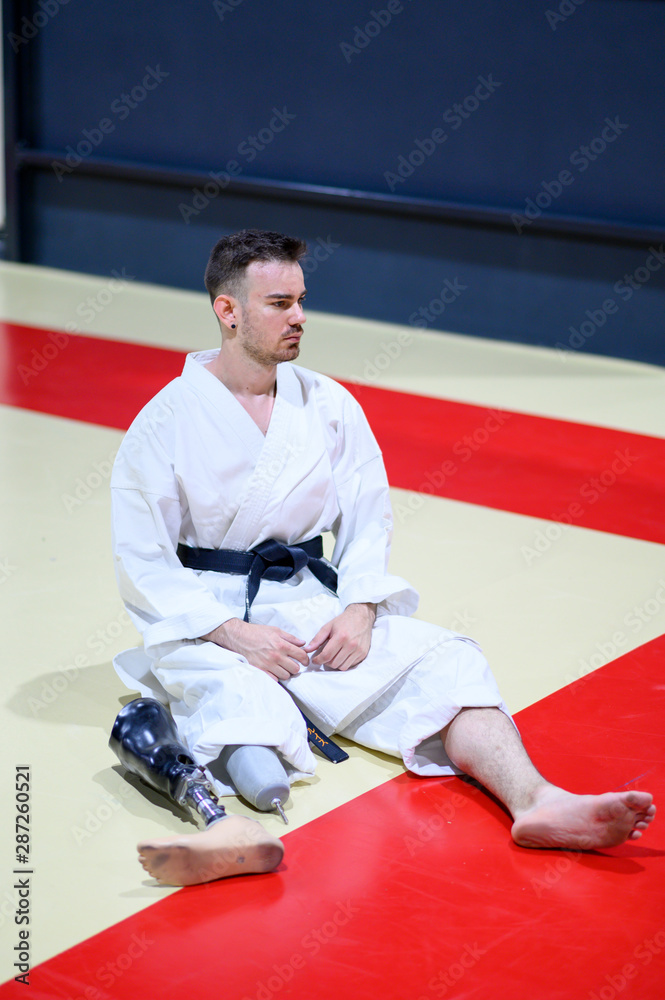 Karate man with prosthetic leg sitting preparing his leg