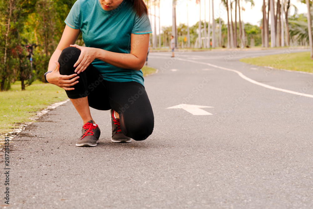 fitness woman runner feel pain on knee. Outdoor exercise activities concept