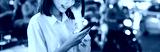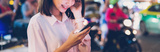 Closeup of woman holding a smartphone at night on city shopping street, and people walk. Technology for communication concept.