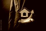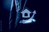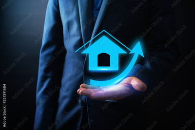 businessman holding home icon with arrow growing up,Real estate stock concept