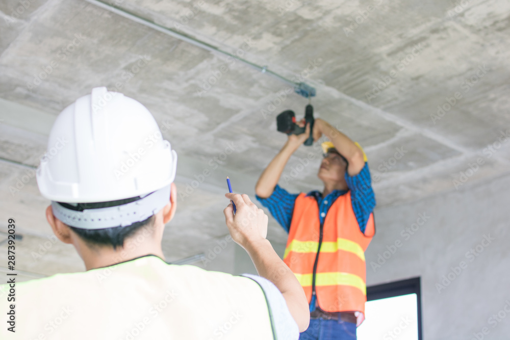 Inspector checking as worker unscrew on plug of electricity by screwdriver