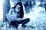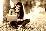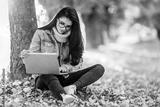 Business woman working on a laptop sitting in the park.