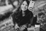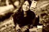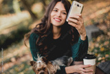 Woman walk with dog, using phone and drink coffee in the park.