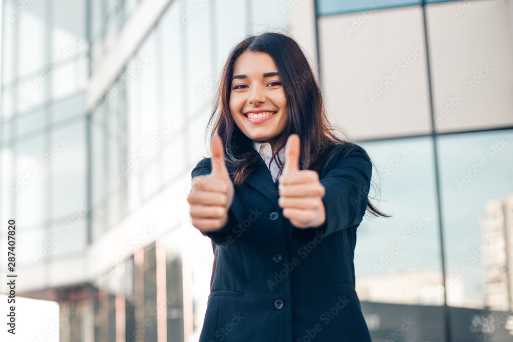 Successful smile businesswoman or entrepreneur shows thumbs up standing in front of his office.