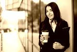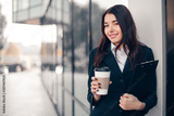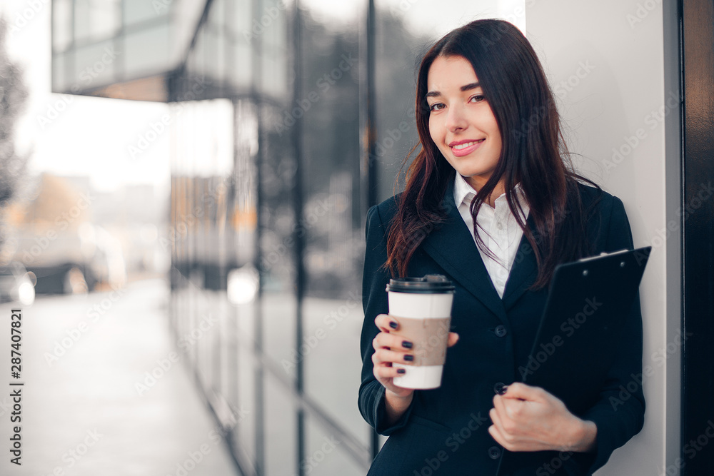 Successful smiling businesswoman or entrepreneur drink coffee in front of his office.