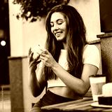 Beautiful woman using phone and drink coffee sitting on street cafe.