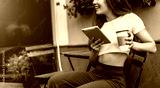 Beautiful woman using tablet and drink coffee sitting in street cafe.