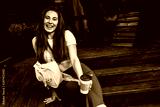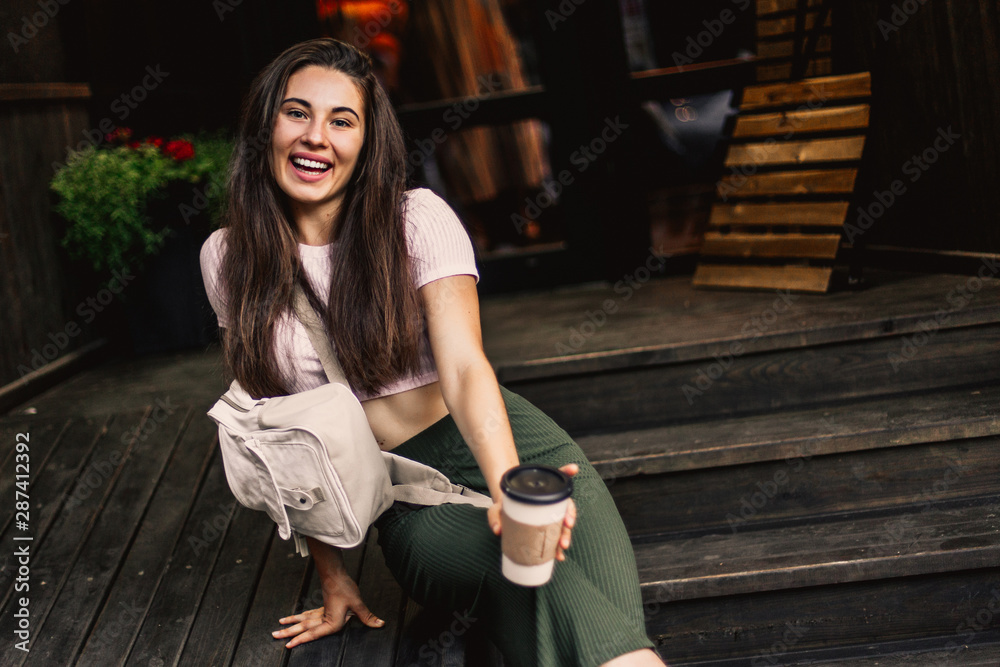 Happy smiling woman drink coffee sitting on wooden steps in street.