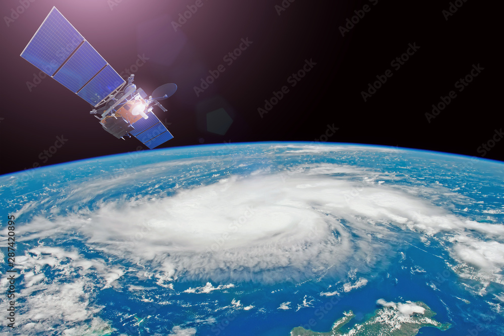 Research, probing, monitoring hurricane. Satellite above the Earth makes measurements of the weather parameters. Elements of this image furnished by NASA.