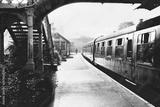film black and white steam train and carraiges on the platform at Weybourne Station, Norfolk, England