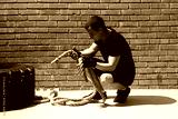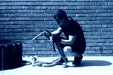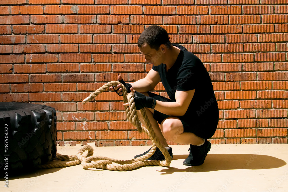 against a brick wall, a man in black uniform, engaged in cross-fit with a rope and tire, close-up