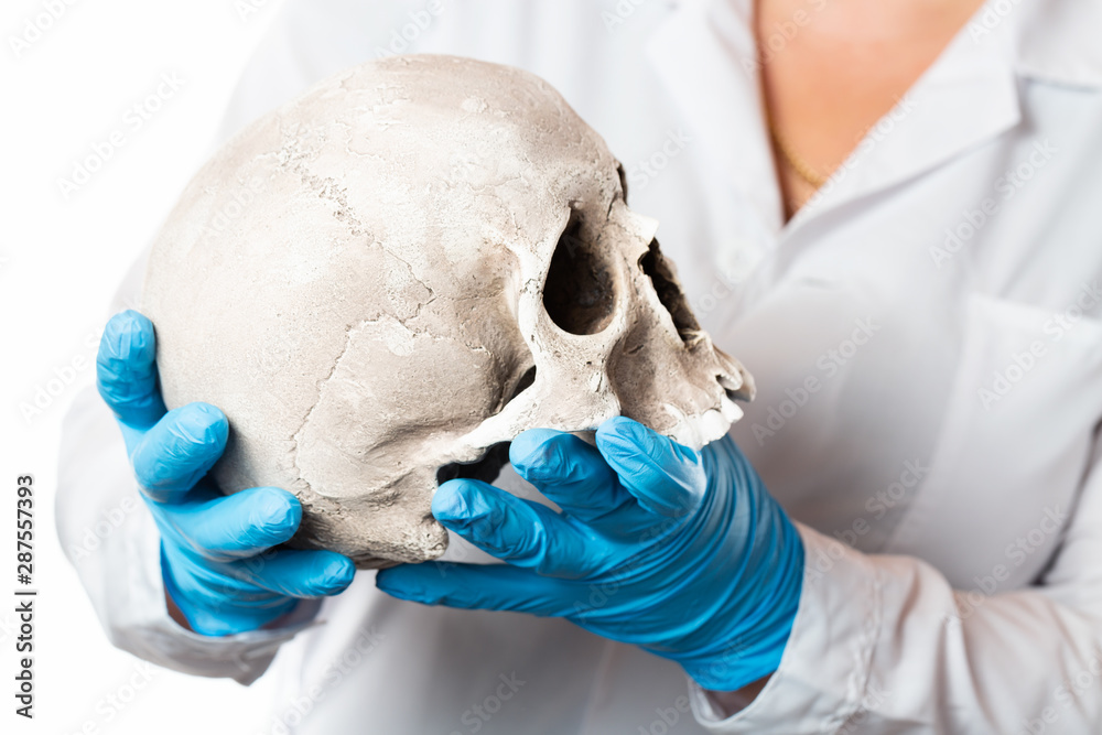 Forensic pathologist. Doctor in rubber gloves holding human skull.
