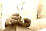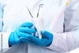 Oral dental hygiene. Healthy white tooth model and dentist mirror with explorer probe instrument in dentist hands.