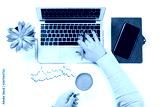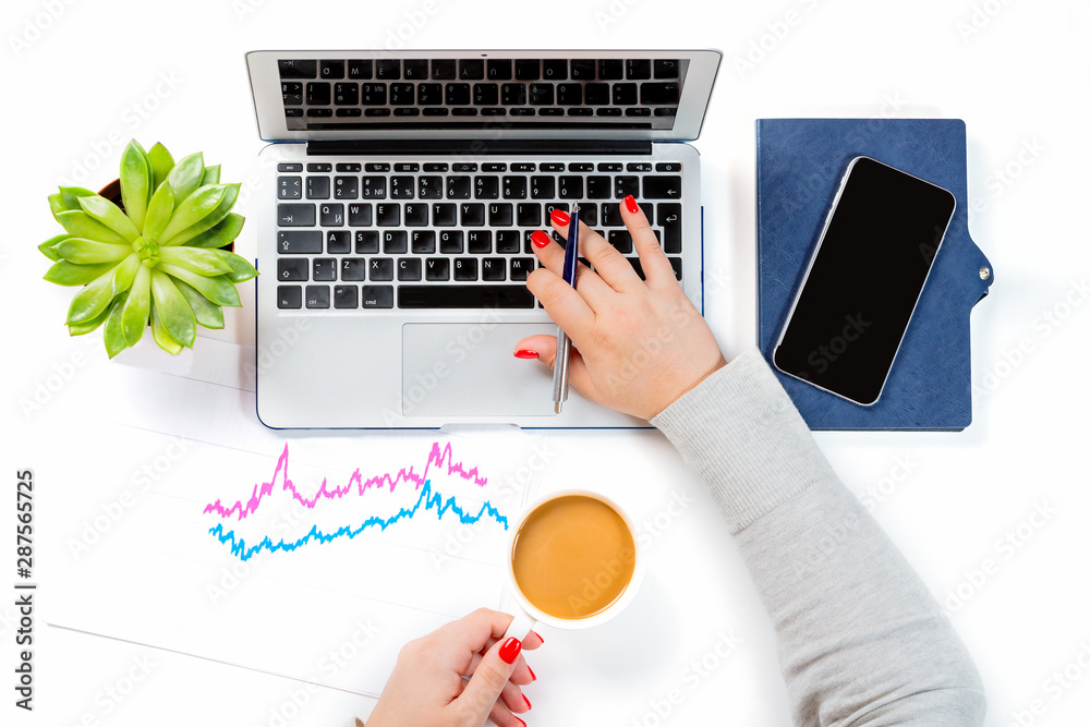 Top view of office desk table. Woman holding cup of coffee and working on modern laptop near mobile phone, plant pot and finance graph chart