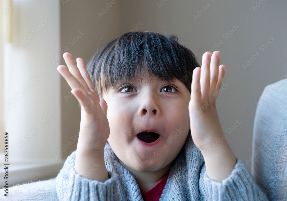 Portrait of surprised and shocked caucasian kid with eyes widened and mouth opened, Head shot funny kid, Child shouting loud with shocked face and raising hands up