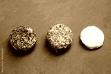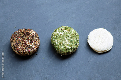 Fromages de chèvre aux herbes, poivre, et nature sur fond ardoise