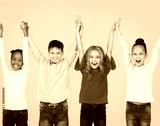 Happy school children raised hands together, yellow background