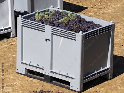 Large plastic bulk bin for processing food industry, full of freshly harvested grapes