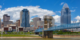 View of the Cincinnati, Ohio skyline and John Roebling suspension bridge from across the Ohio River