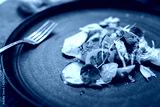 Grilled scallops, ripe and unripe peach, nasturtium leaves, celery