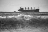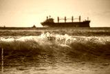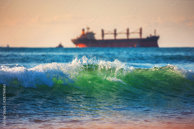 Sailing cargo ship and waves at sunrise. Transportation. Logistics. Shipping.
