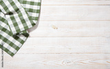 Kitchen towel on empty wooden table. Napkin close up top view mock up for design. Kitchen rustic background.
