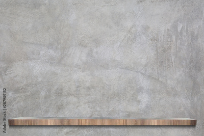 Raw cement or concrete wall with empty wooden shelves in loft Style for background.