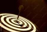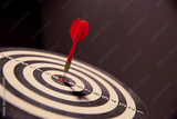 Red dart arrow hitting in the target center of dartboard on bullseye for Business focus concept.